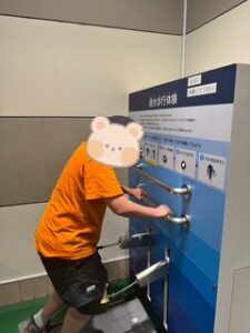 火事を想定した避難訓練だったので、避難後は水消火器を使って鎮火の訓練も行いました!